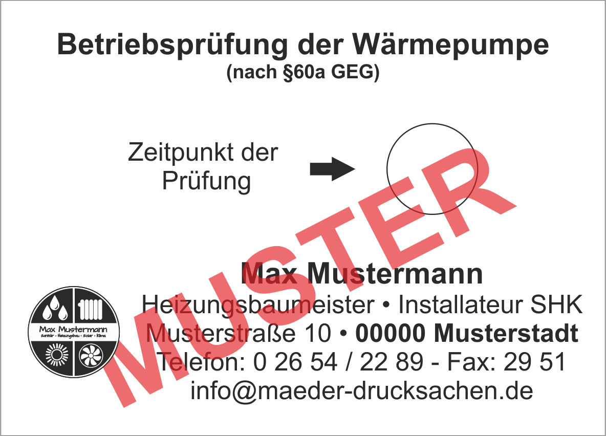 Haftetiketten "Betriebsprüfung Wärmepumpe", Eigenes Logo, Schwarzdruck, PET Folie weiß